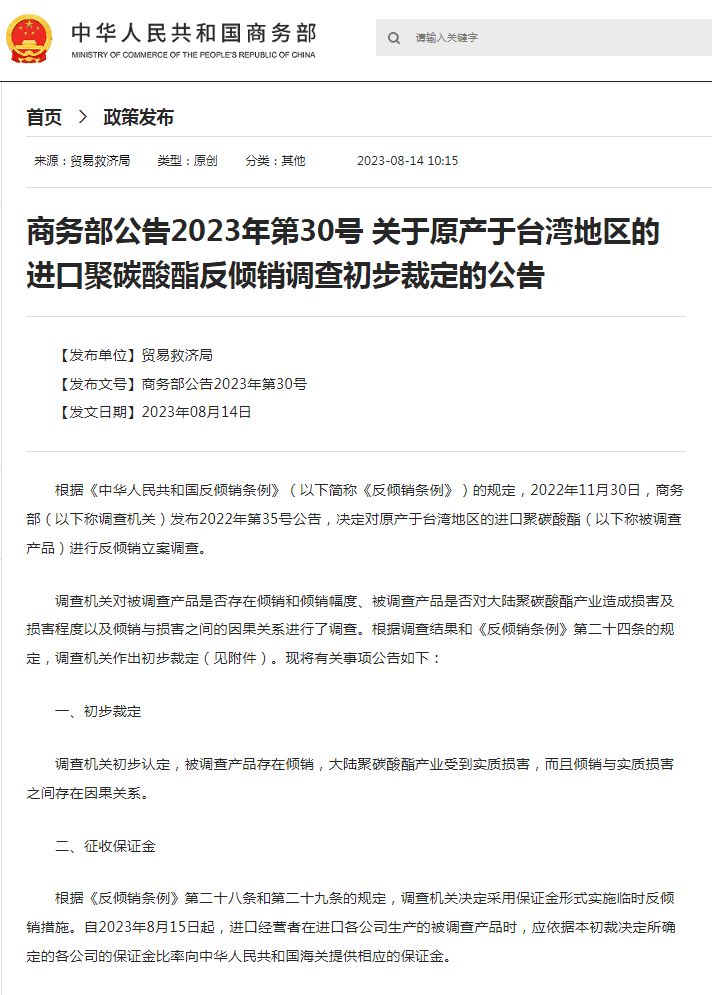 物化特性:被調查產品是分子主鏈含雙酚A型碳酸酯基結構的高分子聚合物,外觀通常為透明的圓柱狀或球形粒子或固體粉末,具有抗沖擊強度高、加工性能好、透光率高、耐熱及耐寒性好等性能。主要用途:聚碳酸酯可用于電子電器、板材/薄膜、汽車、光學、包裝、醫療器械、安全防護等諸多領域。該產品歸在《中華人民共和國進出口稅則》:39074000。該稅則號項下雙酚A型聚碳酸酯按重量計含量小于99%的產品不在本次被調查產品范圍內。對臺灣地區公司征收的保證金比率如下:1.臺灣化學纖維股份有限公司 16.9%(FORMOSA CHEMICALS & FIBRE CORP.)2.臺灣出光石油化學股份有限公司 16.9%(IDEMITSU CHEMICALS TAIWAN CORPORATION)3.奇美實業股份有限公司 17.0%(CHIMEI CORPORATION)4.奇菱科技股份有限公司 17.0%(CHILIN TECHNOLOGY CO.,LTD.)5.其他臺灣地區公司 22.4%三、征收保證金的方法自2023年8月15日起,進口經營者在進口原產于臺灣地區的聚碳酸酯時,應依據本初裁決定所確定的各公司的保證金比率向中華人民共和國海關提供相應的保證金。保證金以海關審定的完稅價格從價計征,計算公式為:保證金金額=(海關審定的完稅價格×保證金征收比率)×(1+進口環節增值稅稅率)。四、評論各利害關系方在本公告發布之日起10天內,可向調查機關提交書面評論意見。(來源:商務部網站)