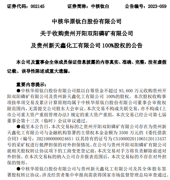 公司與雙陽磷礦、新天鑫化工及其全體股東分別簽署《關于貴州開陽雙陽磷礦有限公司的股權轉讓協議》、《關于貴州新天鑫化工有限公司的股權轉讓協議》,分別以4.78億元、4.41億元收購雙陽磷礦及新天鑫化工100%的股權。本次交易完成后,公司持有雙陽磷礦及新天鑫化工100%的股權,雙陽磷礦、新天鑫化工成為公司的全資子公司,納入公司的合并報表范圍。