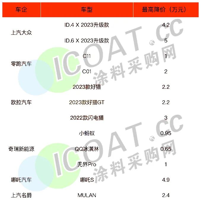 據(jù)涂料采購(gòu)網(wǎng)不完全統(tǒng)計(jì),8月以來,上汽大眾、蔚來、零跑、奇瑞、長(zhǎng)城歐拉、埃安、哪吒、上汽名爵、理想、問界等10多個(gè)品牌先后宣布降價(jià)或變相優(yōu)惠,現(xiàn)金補(bǔ)貼、免費(fèi)保養(yǎng)、終身維護(hù)、優(yōu)惠延長(zhǎng)等大招頻出,只為刺激市場(chǎng),拉動(dòng)銷量。