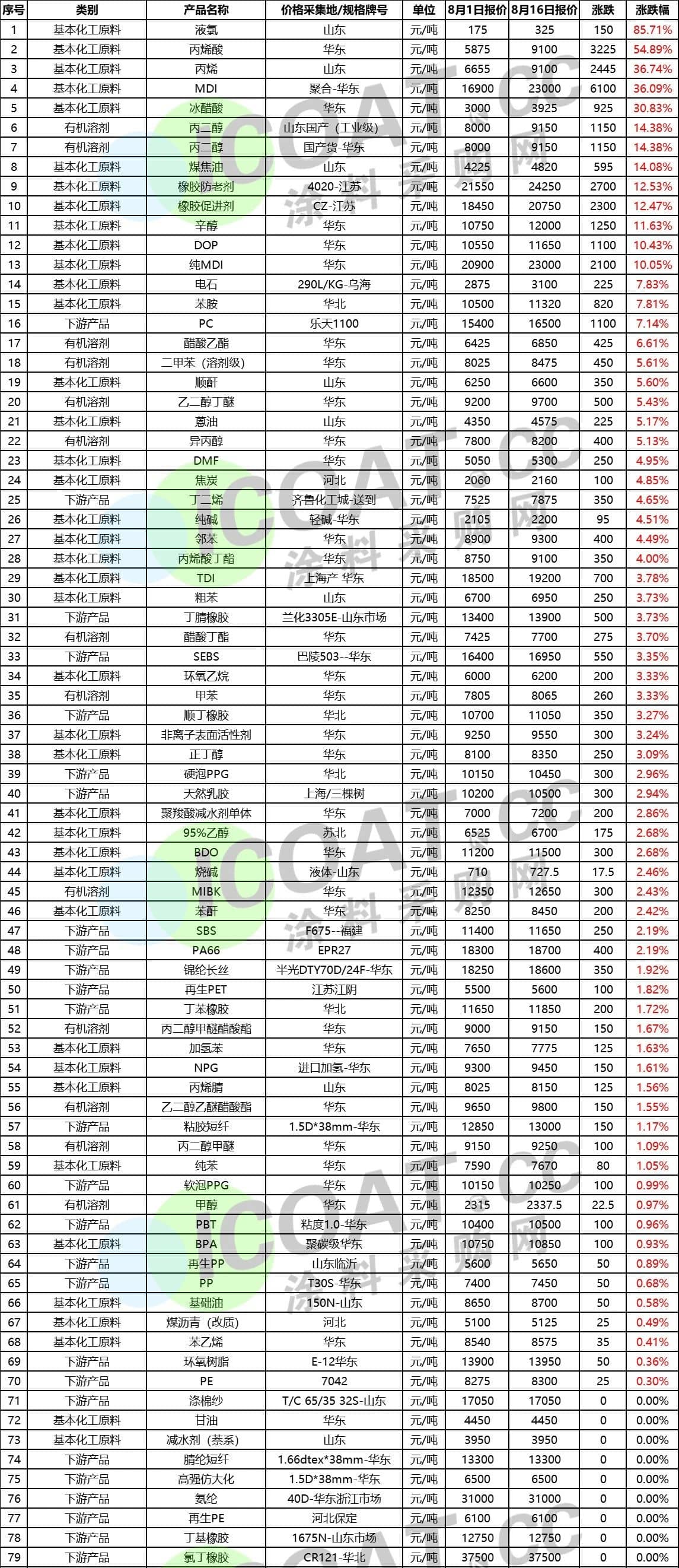 環(huán)氧氯丙烷:多數(shù)生產(chǎn)企業(yè)新單報盤大穩(wěn)小動,部分地區(qū)賣盤出貨不暢,新單報盤可商談,下游跟進謹(jǐn)慎,業(yè)者多關(guān)注場內(nèi)裝置開工變動。丙烯:山東丙烯市場主流參照6800-6800元/噸。供應(yīng)下降預(yù)期保持,生產(chǎn)企業(yè)低位報盤調(diào)漲跟進,市場成交重心繼續(xù)走高。但下游聚丙烯需求持弱,本壓力上升,工廠采購積極性不佳,高位接受度仍然一般,丙烯市場上漲幅度較為受限。苯酐:原料鄰苯市場高位運行,工業(yè)萘市場企穩(wěn)運行,成本端支撐尚可,且相對低位下,下游補貨動作伴隨,交投量有所釋放,工廠現(xiàn)貨趨緊。二氯甲烷:市場價格基本保持穩(wěn)定,個別價格小幅上漲但漲幅較低,價格漲至高位之后市場看空氣氛十分明顯,雖然不斷有利好信號刺激市場,但市場整體氛圍仍偏向看空。山東地區(qū)當(dāng)前銷售壓力較大,企業(yè)壘庫速度較快,預(yù)期下周上半周將有壓力出現(xiàn),而廣州及周邊一帶當(dāng)前庫存偏低,價格調(diào)整或略滯后于山東。正丁醇:繼丁醇連續(xù)上行之后,因裝置檢修預(yù)期提振仍存,下游逢低采購積極性依舊較好,短期正丁醇偏強運行可能較大。丙烯酸及丁酯:在原料丁醇連漲及多數(shù)酸酯產(chǎn)品現(xiàn)貨供應(yīng)偏少的提振之下,酸酯持貨方集中漲價,提振下游部分剛需入市,交投重心存不同程度上行。原料丁醇偏強運行的概率較大,預(yù)估酸酯市場將延續(xù)漲價趨勢,不過需關(guān)注下游對迅速上漲后的新價格的接受程度。……據(jù)不完全統(tǒng)計,自8月份以來,國內(nèi)化工原材行業(yè)價格漲勢大于跌勢,總體行情有所恢復(fù),但較2022年同期相比,仍處于底部位置。根據(jù)市場變化,涂料采購網(wǎng)整理了70多種的材料價格漲幅榜,具體如下: