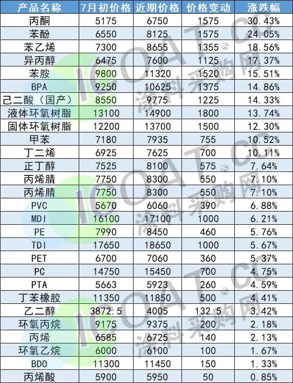 ;異丙醇近期報(bào)價(jià)7600元/噸,較7月初價(jià)格上漲1125元/噸,漲幅17.37%;
