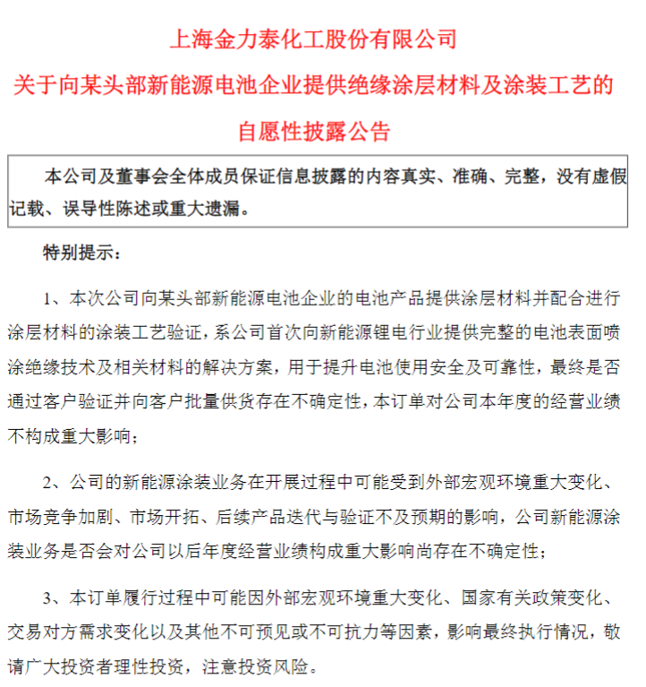 上海金力泰化工股份有限公司(以下簡稱“公司”、“上市公司”)于近日收到來自某頭部新能源電池企業的訂單,公司將為其電池產品提供絕緣涂層材料并配合進行涂層材料的涂裝施工工藝驗證。本次訂單系公司首次向新能源鋰電行業提供完整的電池表面絕緣噴涂技術及相關材料的解決方案,完成電池產品的噴涂打樣及涂裝施工工藝驗證,目前尚未形成規模化訂單。