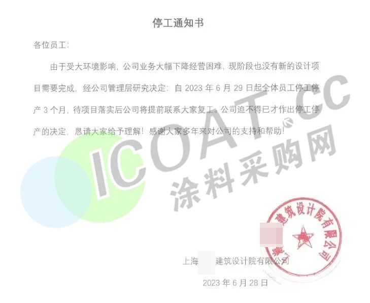 7月底,上海另一家建筑設計公司表示,由于資金緊張導致項目進入停止狀態,公司實際已暫停相關經營活動,決定自8月1日起開始停工停產。