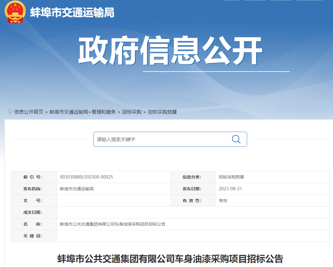 為滿足蚌埠公交車輛車身油漆的需要,我公司擬對“蚌埠市公共交通集團有限公司車身油漆采購項目”進行公開招標,歡迎具備資格條件的國內潛在投標人參加投標。一、項目概況(一)項目名稱:蚌埠市公共交通集團有限公司車身油漆采購(二)項目編號:BBGJ-2023—WXWZ-07(三)項目內容:車身油漆