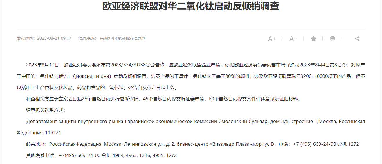 近日,歐亞經濟委員會發布第2023/374/AD38號公告稱,應歐亞經濟聯盟企業申請,依據歐亞經濟委員會內部市場保護司2023年8月4日第8號令,對原產于中國的二氧化鈦(俄語:Диоксид титана)啟動反傾銷調查。涉案產品為干量計二氧化鈦大于等于80%的顏料,涉及歐亞經濟聯盟稅號3206110000項下的產品,但不包括用于生產香料及化妝品、藥品和食品的二氧化鈦。公告自發布之日起生效。