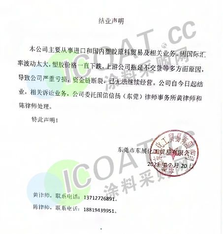 北化股份提到的“微利”乃至“虧損”并不是危言聳聽,近幾年的化工市場可謂是波譎云詭。據涂料采購網了解,多家國內外知名化工企業于近期陸續宣布關停工廠、關閉產能,停產結業、放假解散等“躺平”的通知也屢見不鮮。深耕27年的東展化工發布結業聲明,稱因塑膠原料貿易形勢嚴峻、國際匯率波動幅度太大,導致塑膠價格一直處于下跌態勢,再加上上游合作伙伴因業務陷入困局而無法支付貨款,使得虧損嚴重、資金鏈斷裂、不得不選擇全面停產結業。在這份聲明中,東展化工還委托相關律所,繼續推進公司所涉及的訴訟案件。