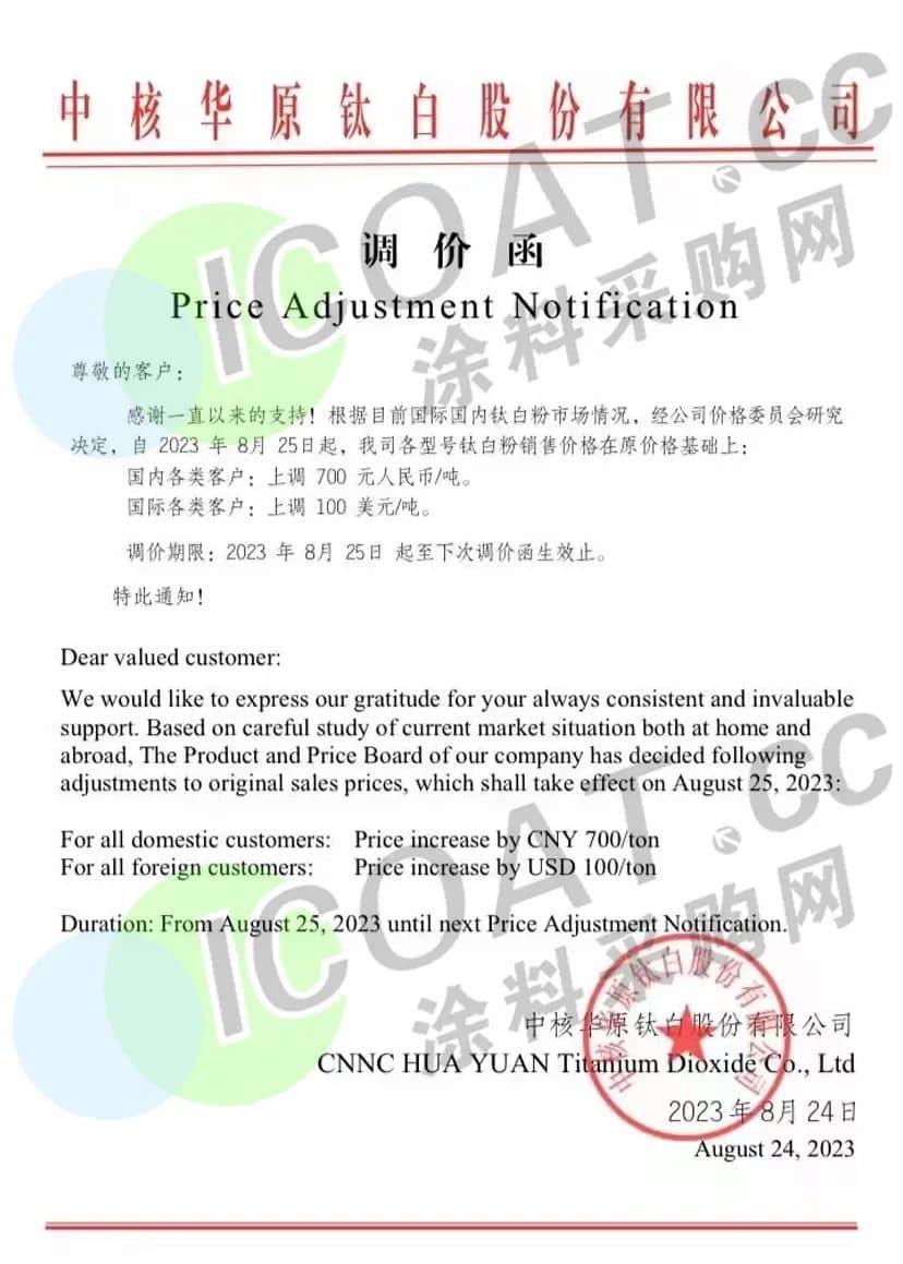 昨日(24日),龍佰集團發(fā)布調價函,稱8月24日起,各型號鈦白粉銷售價格在原價基礎上,對國內各類客戶上調700元/噸,對國際各類客戶上調100美元/噸。