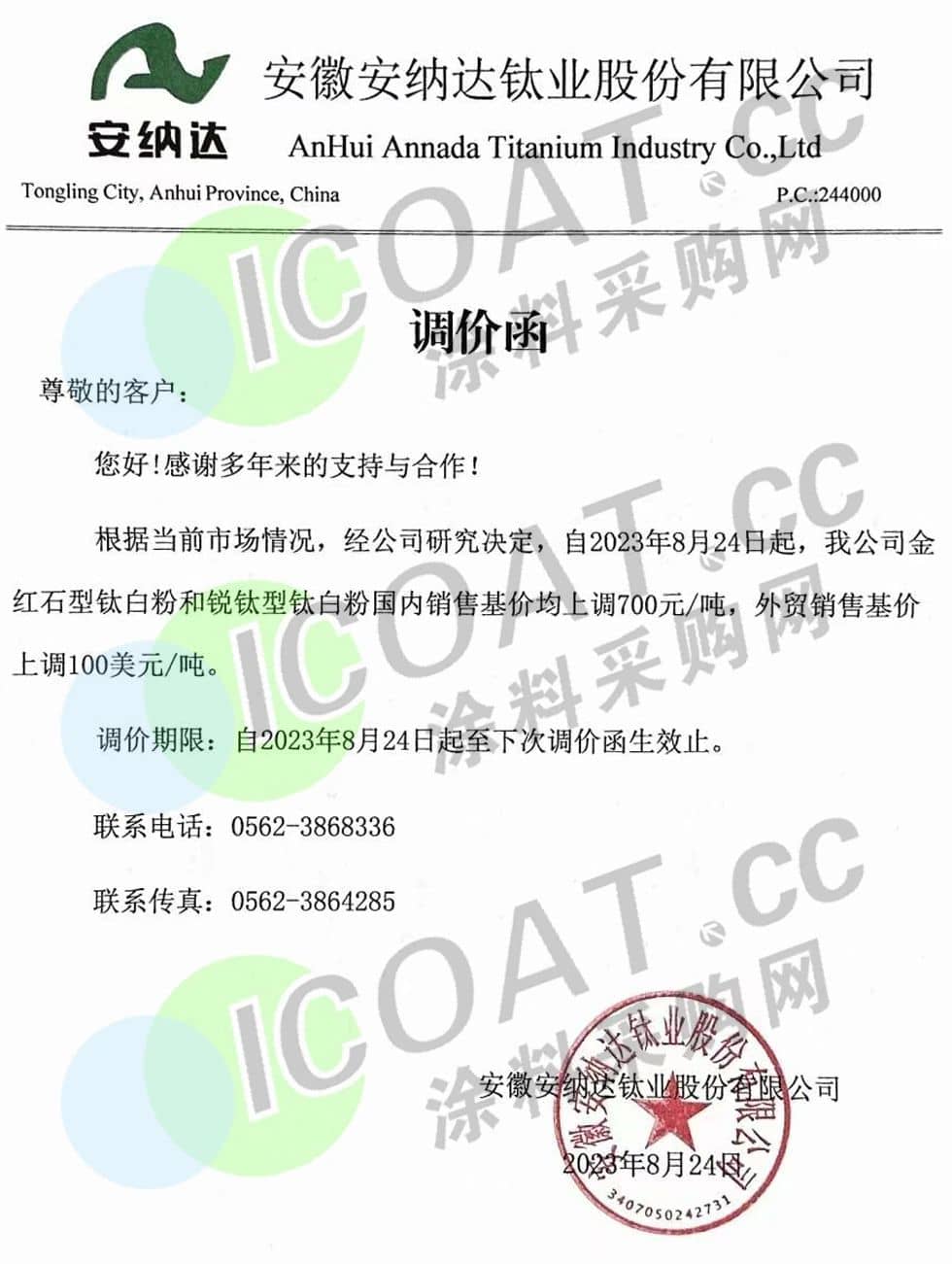 安納達表示,8月24日起,金紅石型鈦白粉和銳鈦型鈦白粉國內銷售基價均上調700元/噸,外貿銷售基價上調100美元/噸。