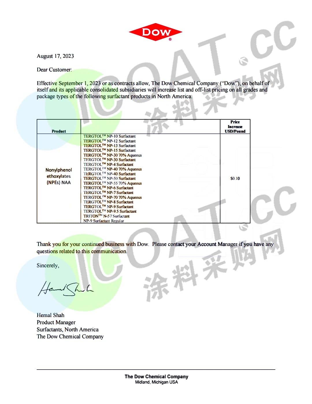 陶氏化學發(fā)布漲價函稱,自9月1日起上調北美地區(qū)所有等級和包裝類型的表面活性劑價格,最高上漲為0.1美元/磅(約合人民幣1612元/噸)。而在此前,陶氏有機硅曾宣布,對陶氏化學有機硅高能建筑業(yè)務主要產(chǎn)品實施價格提升,調整的漲幅為5-10%。
