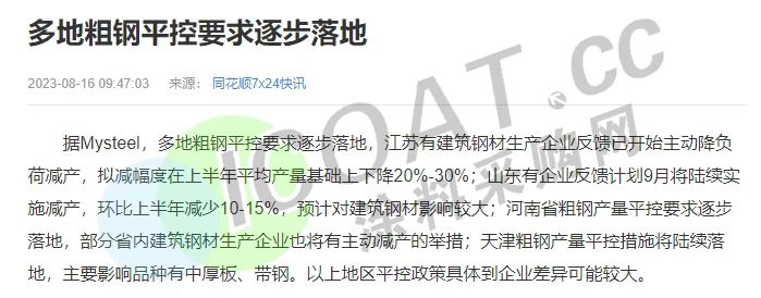 近日,多地粗鋼平控要求逐步落地。江蘇有建筑鋼材生產企業反饋已開始主動降負荷減產,擬減幅度在上半年平均產量基礎上下降20%-30%;山東有企業反饋計劃9月將陸續實施減產,環比上半年減少10-15%,河南部分省內建筑鋼材生產企業也將有主動減產的舉措;天津粗鋼產量平控措施將陸續落地,主要影響品種有中厚板、帶鋼。