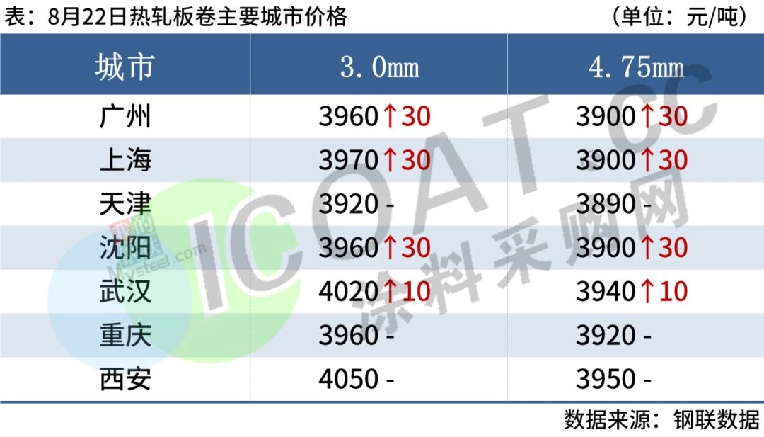 熱軋板卷市場,全國24個主要城市4.75mm熱軋板卷均價3955元/噸,較上個交易上漲7元/噸。