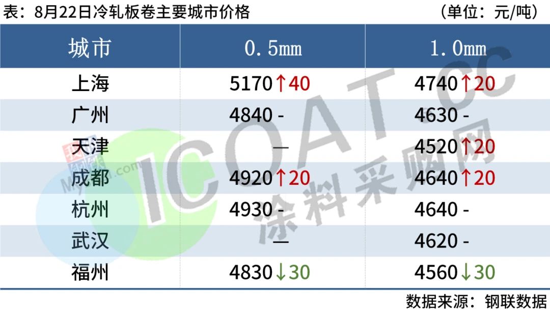 冷軋板卷市場,全國24個主要城市1.0mm冷卷均價4643元/噸,較上個交易日上漲1元/噸。