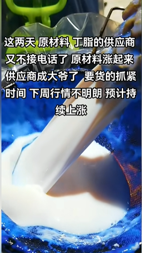 某乳液企業表示,這兩天原材料丁脂的供應商又不接電話了,原材料漲起來,供應商成大爺了。要貨的抓緊時間,下周行情不明朗,預計持續上漲。