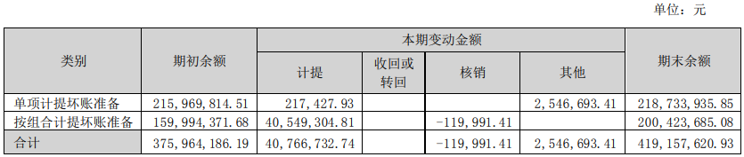 應收賬款壞賬準備期末余額為419,157,620.93元。
