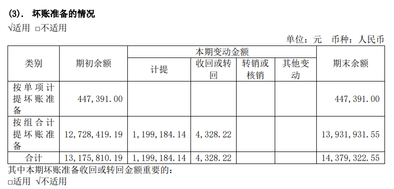 應收賬款壞賬準備期末余額為14,379,322.55元。