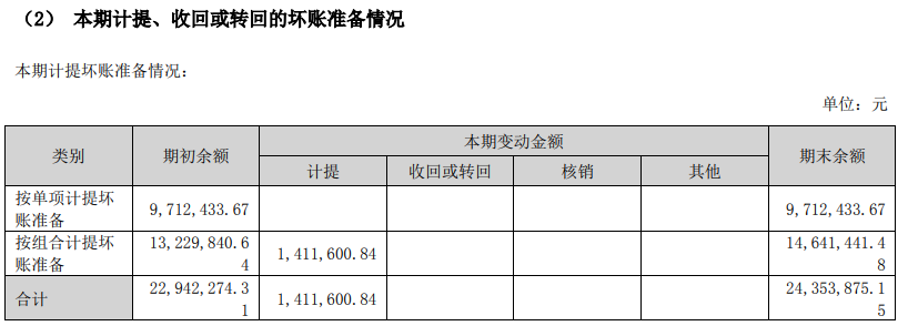 應收賬款壞賬準備期末余額為1,837,796.23元。