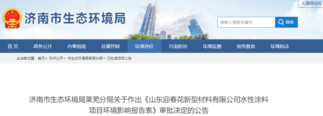 近日,山東省濟南市生態環境局萊蕪分局關于作出《山東迎春花新型材料有限公司水性涂料項目環境影響報告表》審批決定的公告。