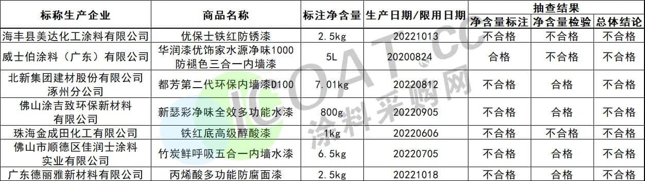 除此之外,知名涂料企業(yè)威士伯涂料、北新建材等因凈含量標注或凈含量檢驗不合格,最終被標記為“不合格”。