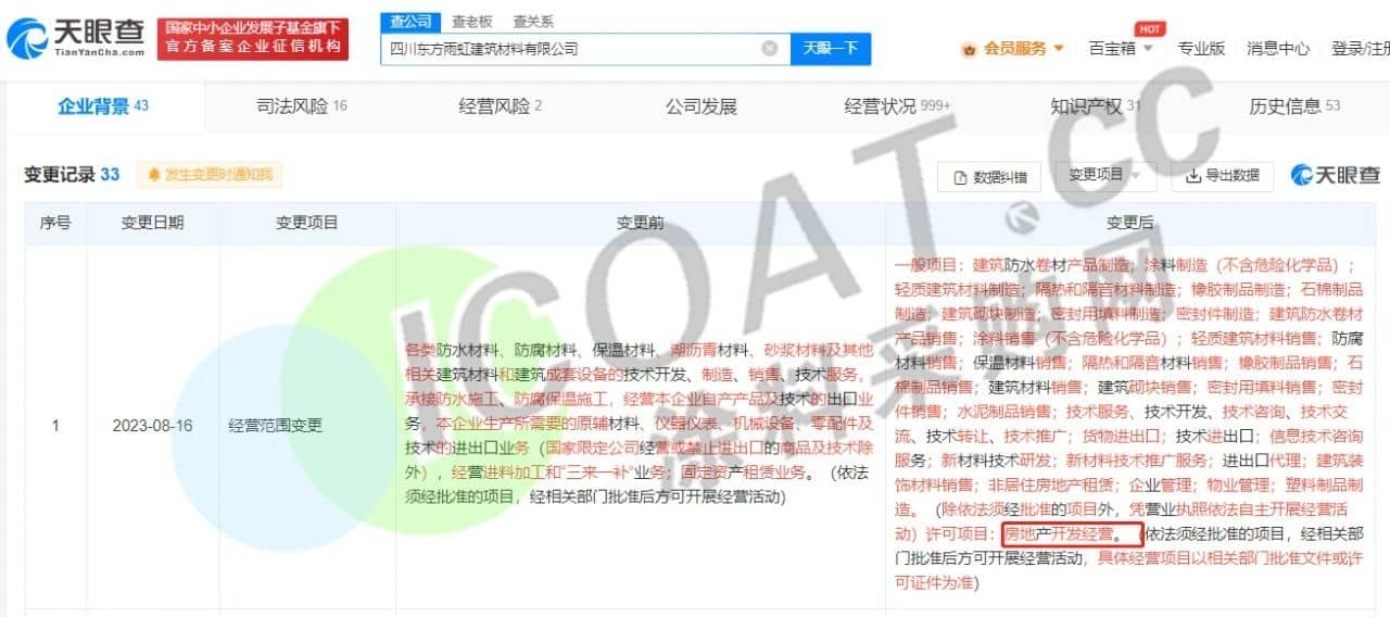 與高管層同時變動的,還有四川東方雨虹的經營范圍。天眼查平臺顯示,經營范圍增加了“房地產開發經營”,這也能夠看出其大股東東方雨虹的小心思。近段時間東方雨虹已經多次參與土地競拍,僅6月、7月兩個月時間,東方雨虹參與了7次土拍搖號環節。