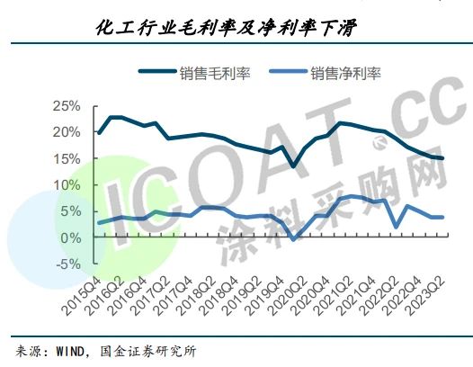 23年上半年化工行業的盈利能力有所削弱,行業整體毛利率為 15.1%,同比下滑 3.6%;行業整體凈利率為 3.5%,同比下滑 2.9%。