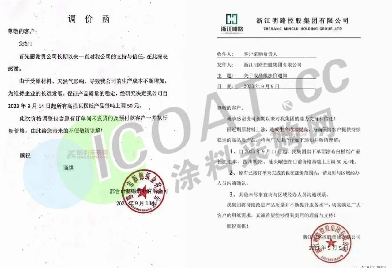 臺市新錦紙業、棗莊市恒宇紙業、浙江華天再生資源、江蘇富星紙業、 山東豐源中盛紙業、江蘇金田紙業、山東豐碩紙業、浙江明路控股集團、河南匯祥再生資源科技、四川華僑鳳凰紙業等宣布產品每噸上調50元。