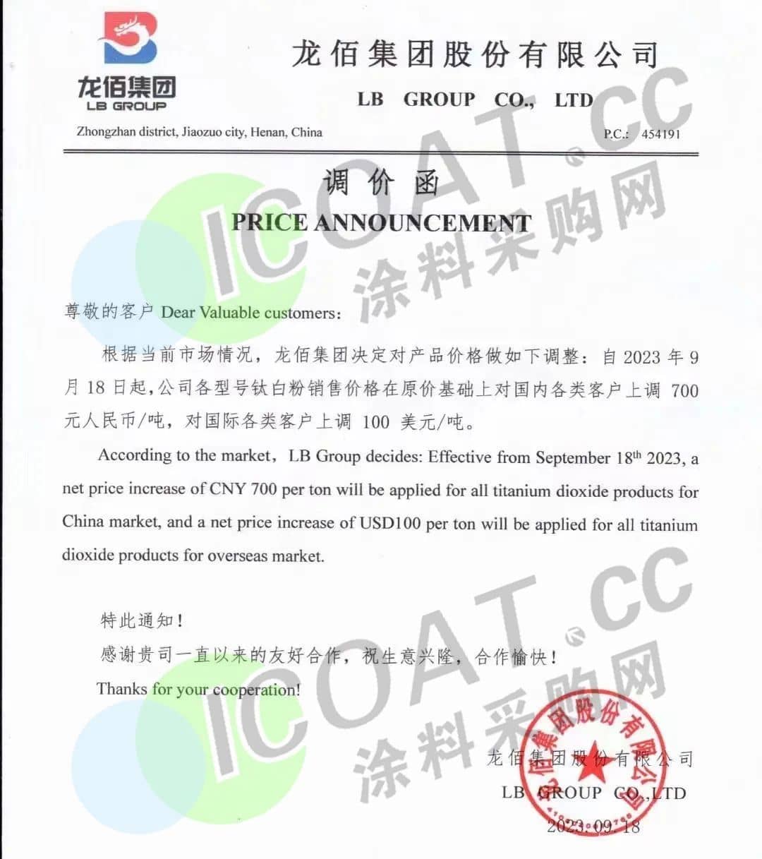 昨日(18日),龍佰集團(tuán)發(fā)布調(diào)價(jià)函,宣布當(dāng)日起,各型號(hào)鈦白粉銷售價(jià)格在原價(jià)基礎(chǔ)上對(duì)國(guó)內(nèi)各類客戶上調(diào)700元/噸,對(duì)國(guó)際各類客戶上調(diào)100美元/噸。公開數(shù)據(jù)顯示,上漲過后,R996、LR-961硫酸法涂料用鈦白粉報(bào)價(jià)在17900元/噸左右,BLR-895、896氯化法涂料用鈦白粉報(bào)價(jià)19400元/噸左右。