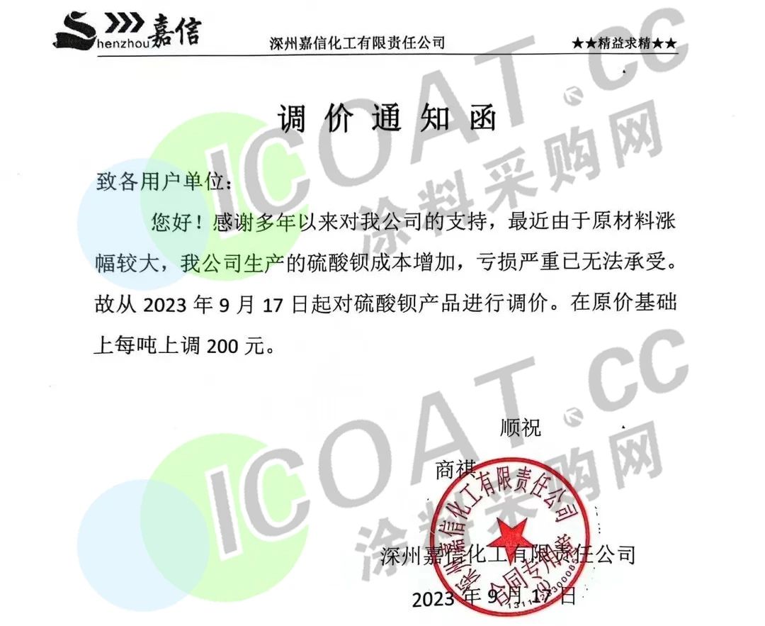 近日,深州嘉信化工發(fā)布調(diào)價(jià)函,稱生產(chǎn)硫酸鋇成本增加,虧損嚴(yán)重已無法承受,故從2023年9月17日起對(duì)硫酸產(chǎn)品上調(diào)200元/噸。