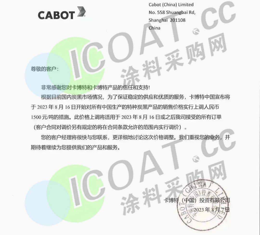 8月份開始,炭黑價(jià)格觸底反彈。目前橡膠用炭黑價(jià)格已經(jīng)突破一萬大關(guān),且還呈現(xiàn)往上飆升的態(tài)勢。2023年9月15日炭黑價(jià)格為11000元/噸左右,并且還有繼續(xù)上漲之勢。炭黑龍頭卡博特宣布對(duì)所有中國生產(chǎn)的特種炭黑產(chǎn)品的銷售價(jià)格實(shí)行上調(diào)人民幣1500元/噸。