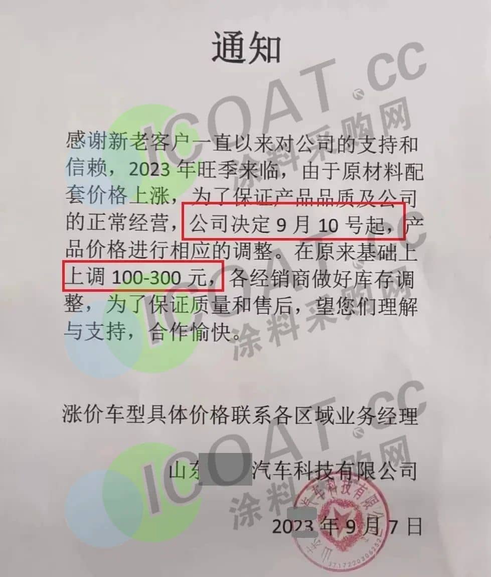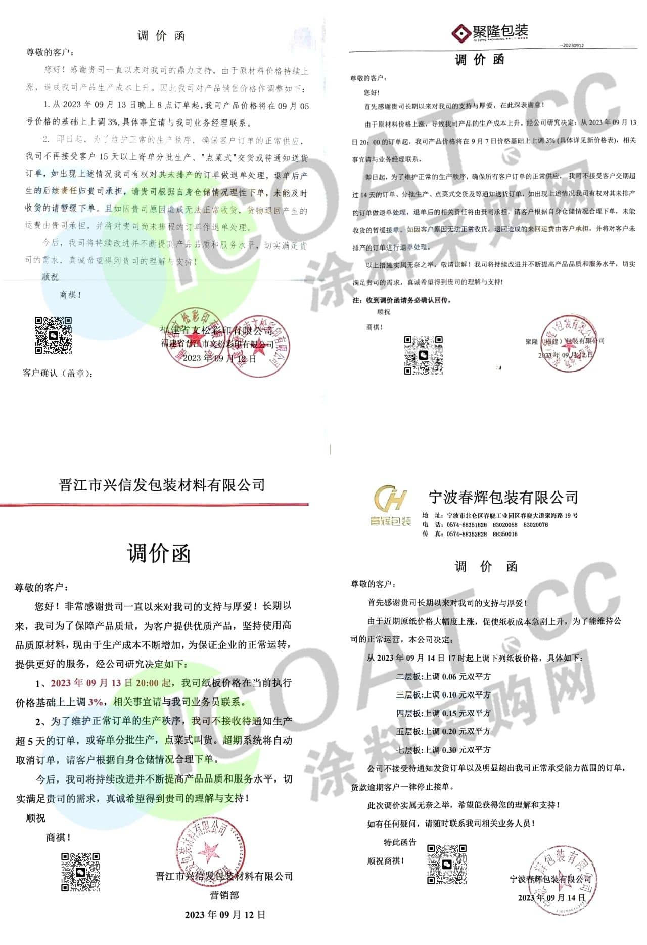 泉州市駿程包裝用品:從2023年9月13日晚上20:00點(diǎn)訂單起,產(chǎn)品價(jià)格在原有價(jià)格基礎(chǔ)上上調(diào)3%。
