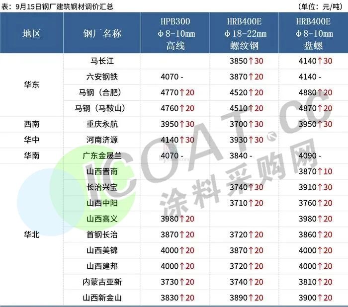 上周五(9月15日),全國累計(jì)15家鋼廠發(fā)布調(diào)價(jià)信息,其中14家鋼廠漲價(jià),整體調(diào)幅在0-30元/噸。
