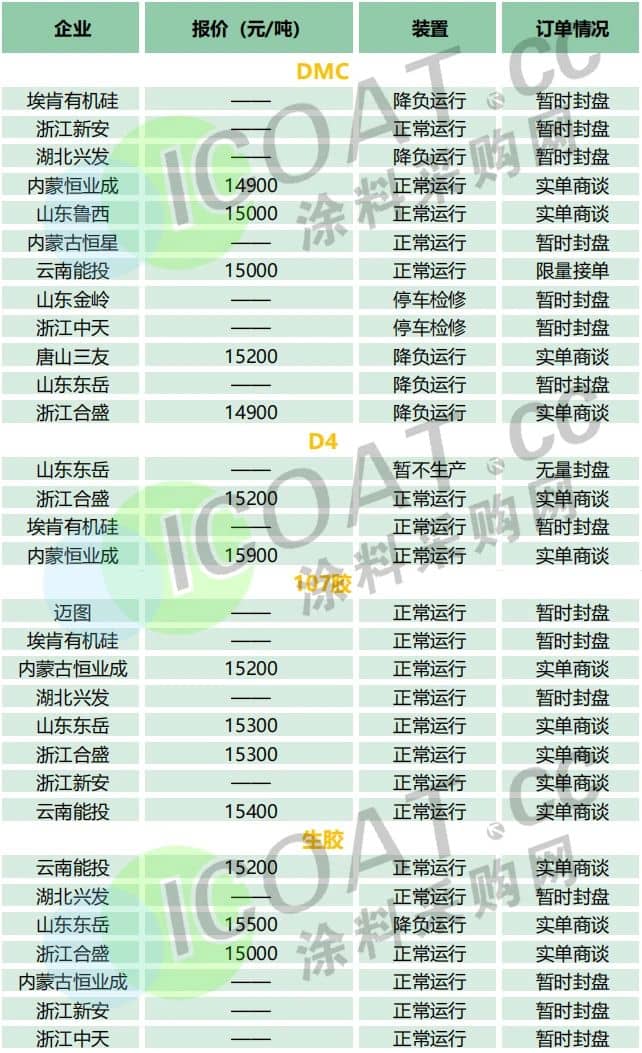 硅料廠庫存有限,供應(yīng)略顯緊張。DMC主力工廠在前期預(yù)售單支撐,以及整體庫存不高的情況下,連續(xù)拉漲,其余單體廠封盤現(xiàn)象增加,疊加部分單體廠停車檢修,DMC現(xiàn)貨流通量減少,價(jià)格大幅上行。