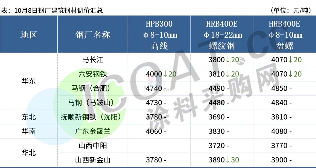 10月8日,全國累計7家鋼廠發布調價信息,其中3家鋼廠降價,整體調幅在0-30元/噸。