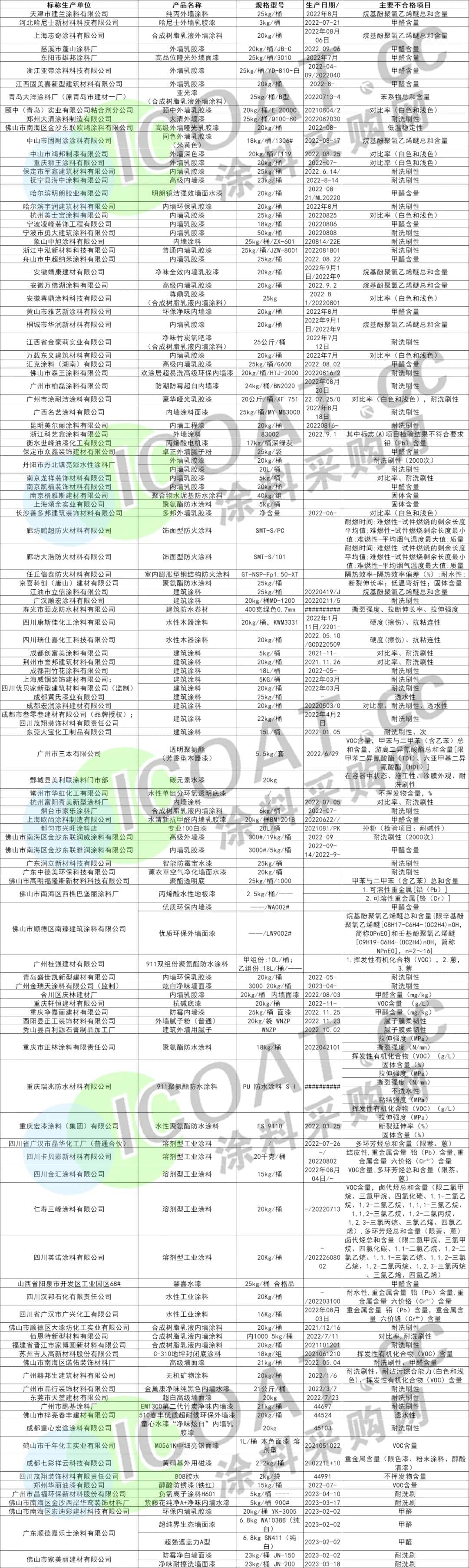 2023年以來部分涂料企業不合格名錄