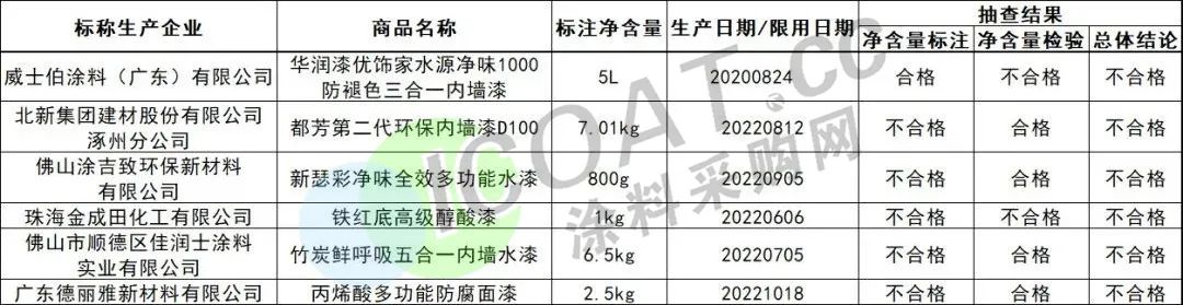 而在廣東省市場監督管理局發布關于2022年定量包裝商品凈含量省級計量專項監督抽查結果的通告中,威士伯涂料(廣東)有限公司生產的華潤漆優飾家水源凈味1000防褪色三合一內墻漆凈含量檢驗不合格;北新集團建材股份有限公司涿州分公司生產的都芳第二代環保內墻漆D100凈含量標注不合格。這也讓不少消費者大跌眼鏡,難道大品牌也靠不住了嗎?