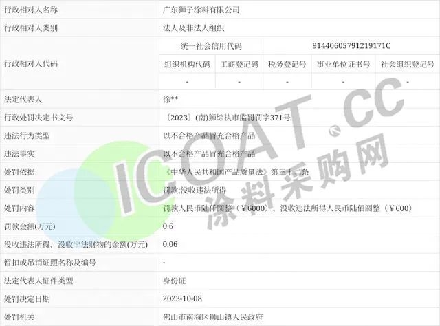 廣東獅子涂料有限公司因銷售不合格產品冒充合格產品,被沒收違法所得600元并罰款0.6萬元。