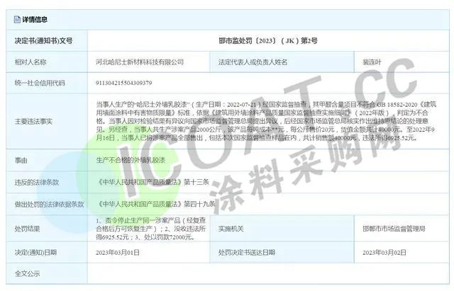 河北哈尼士新材料科技有限公司因生產不合格的外墻乳膠漆,被處以罰款7.2萬元并沒收違法所得。