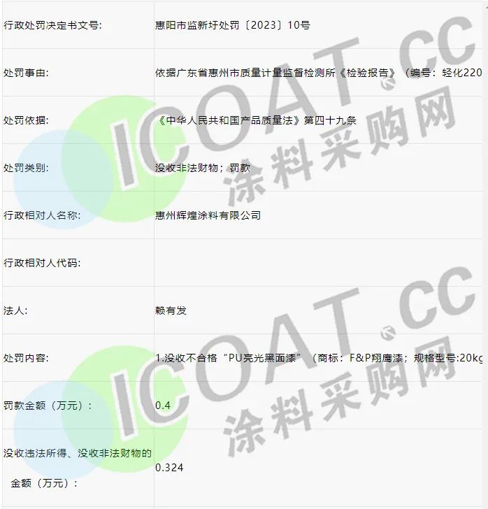 惠州輝煌涂料有限公司生產的“PU亮光黑面漆”“乙二醇醚及醚酯總和含量”項目不符合GB 18581-2020《木器涂料中有害物質限量》標準,判定為監督總體不合格?;葜菔谢蓐枀^市場監督管理局對其罰款人民幣4000元,并沒收不合格產品9桶(其中一桶已開封,已抽樣損耗2kg)。