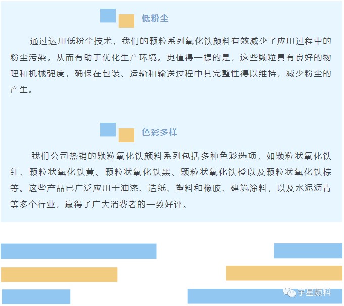 宇星,國家級專精特新“小巨人”企業、國家高新技術企業,歷經40多年的發展,目前年產量達到20萬噸。宇星產品涵蓋氧化鐵紅、黃、黑、棕、綠、橙、藍等,宇星產品不僅光澤鮮艷、性能穩定,而且具有獨特的耐候性和耐腐性,暢銷世界各地。