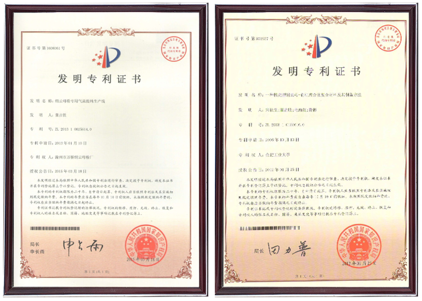 高品質(zhì)、高產(chǎn)量離不開專業(yè)化、高效率的生產(chǎn),作為國家認定的高新技術(shù)企業(yè),萬橋絹云母擁有自己的專利技術(shù),自行研發(fā)了氣流提純絹云母生產(chǎn)線,獲得國家專利。