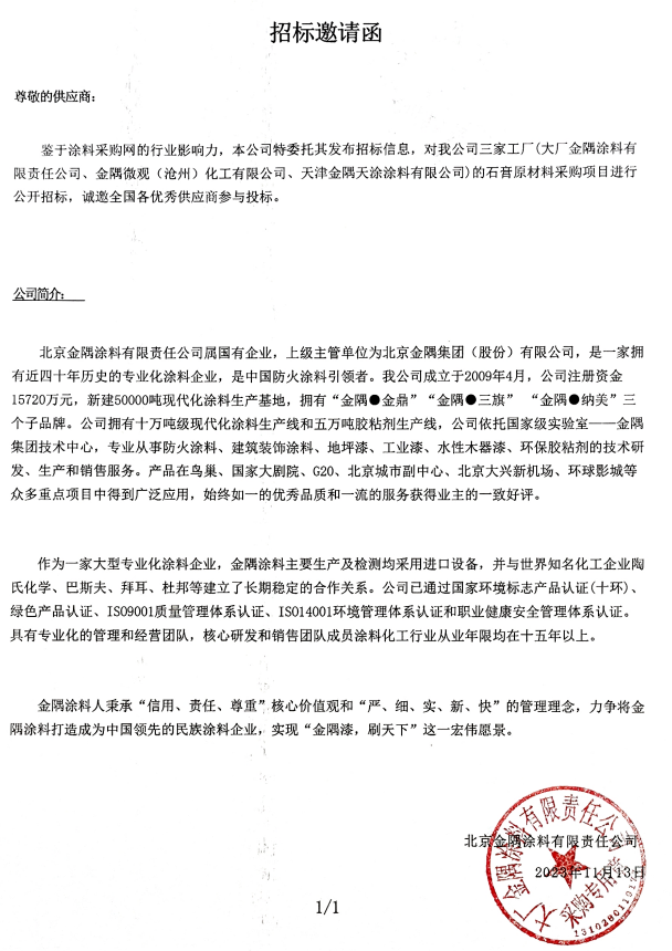 近日,北京金隅涂料有限責任公司發布招標邀請函,稱鑒于涂料采購網的行業影響力,特委托其發布招標信息,對三家工廠(大廠金隅涂料有限責任公司、金隅微觀(滄州)化工有限公司、天津金隅天涂涂料有限公司)的石膏原材料采購項目、包裝袋采購項目進行公開招標,誠邀全國各優秀供應商參與投標。