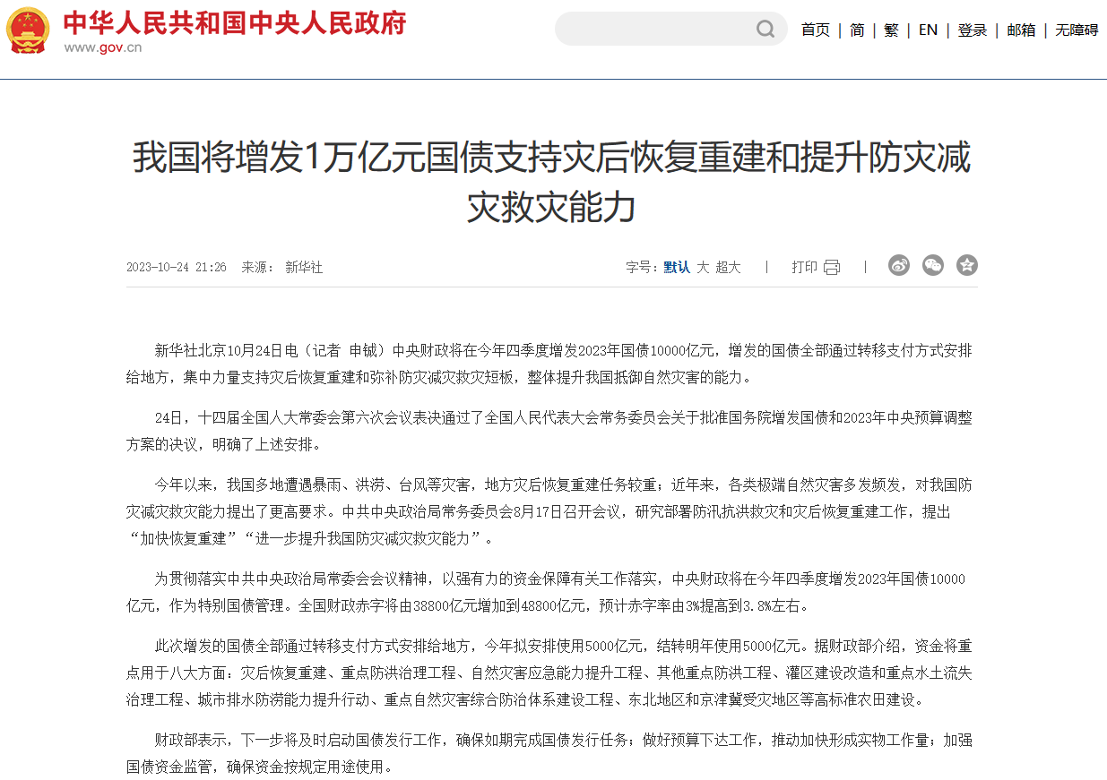 近日利好消息頻傳!高層決定在今年4季度,增發2023年國債1萬億元。本次國債發行資金將主要用于災后重建和水利工程建設,對于水泥、玻璃、涂料/裝飾紙、外墻保溫材料、管材、鋼鐵、膠粘劑等材料都有著巨大的需求。