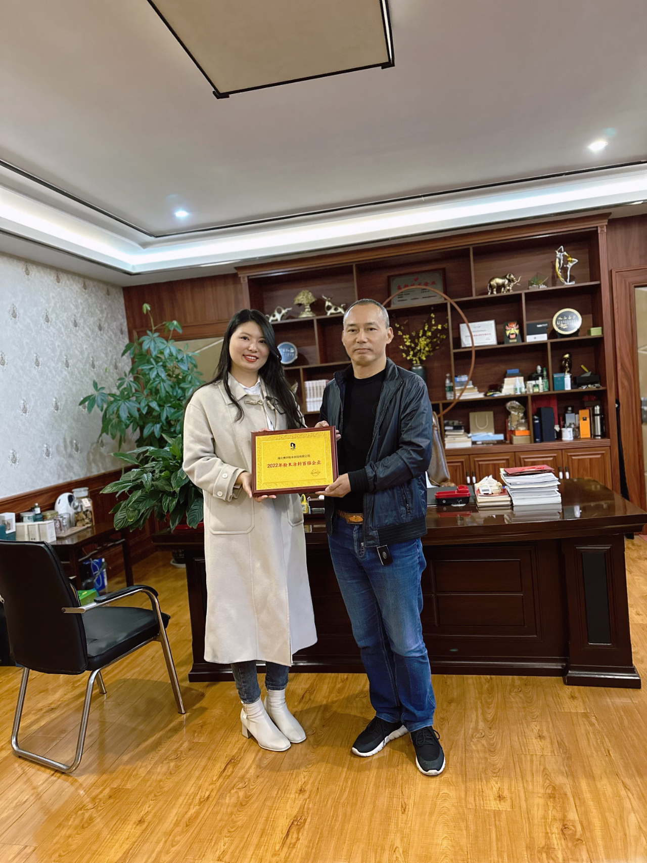 涂料采購網趙辰辰(左)為博宇粉末王總(右)頒發粉末百強獎牌