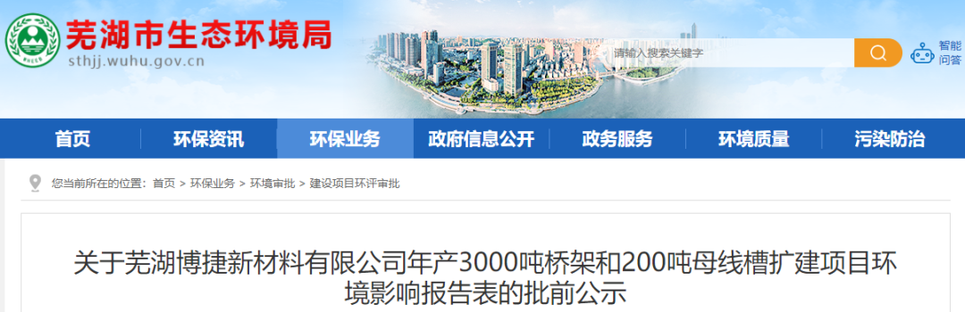 根據(jù)建設(shè)項(xiàng)目環(huán)境影響評價(jià)審批程序的有關(guān)規(guī)定,我局?jǐn)M對蕪湖博捷新材料有限公司年產(chǎn)3000噸橋架和200噸母線槽擴(kuò)建項(xiàng)目環(huán)境影響報(bào)告表作出審批意見。為保證審批意見的嚴(yán)肅性和公正性,現(xiàn)將該項(xiàng)目環(huán)境影響評價(jià)文件基本情況予以公示,公示期為本公示發(fā)布后五個(gè)工作日。如有意見,請于公示期內(nèi)將書面意見反饋至市生態(tài)環(huán)境局行政審批科。