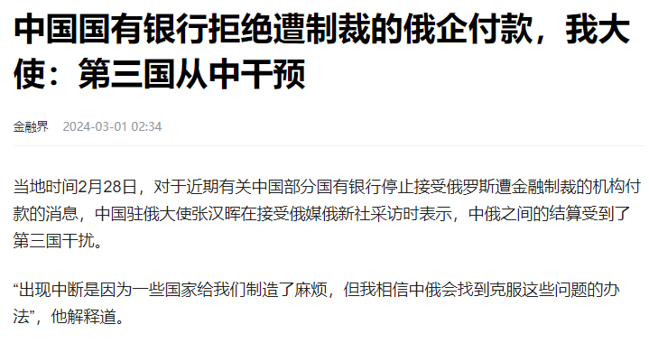中國駐俄大使張漢暉在接受采訪時表示,中俄之間的結算受到了第三國干擾,“之所以出現問題,是因為一些國家給我們制造了問題”。