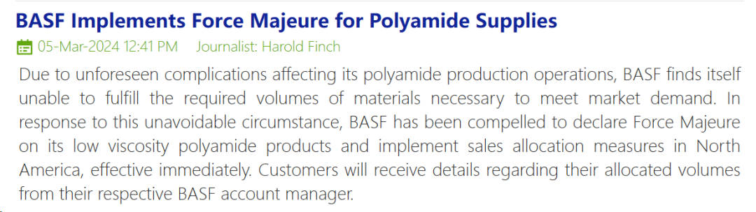 巴斯夫指出,由于市場條件的多變性,銷售分配和交貨計劃可能會發(fā)生變化,正在積極尋求一切合理的途徑,以確定緩解戰(zhàn)略,應對供應鏈中遇到的挑戰(zhàn)。