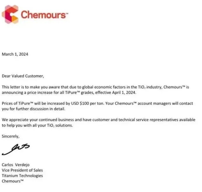 康諾斯中東、非洲、亞洲的鈦白粉漲價200美元/噸。