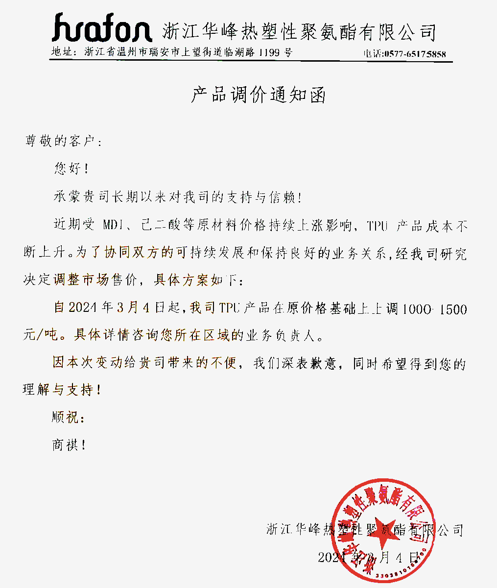 浙江華峰:旗下TPU產(chǎn)品在原價格上調(diào)1000-1500元/噸。