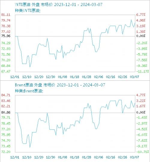 國際油價進入2024年之后連續(xù)兩個月收漲,截至3月7日收盤,紐約商品交易所輕質(zhì)原油期貨價格上漲至每桶80.41美元,倫敦布倫特原油期貨價格也上漲至每桶83.83美元。