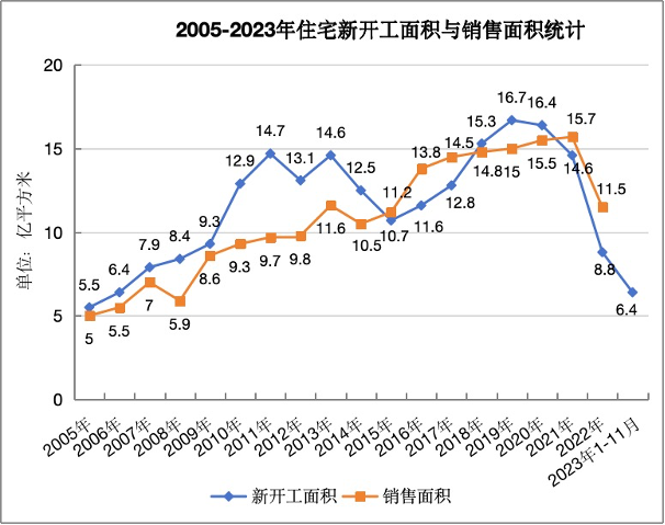 過去兩年里,房企新開工面積呈斷崖式下跌,2023年住宅新開工面積較2019年的峰值下降近6成。2023年1-12月,全國房屋新開工面積同比下降20.4%。