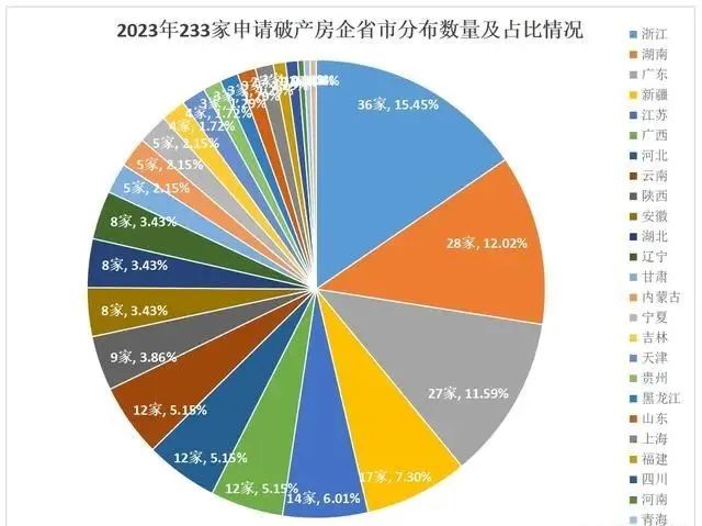 樓市陷入“買不起也賣不掉”的怪圈,既收不回成本也還不起債務,資金鏈斷裂之下唯有破產一條路。2023年全國約有233家房企發布了破產文書,廣東、新疆、浙江、江蘇、湖南五省房企破產數量占總數50%。